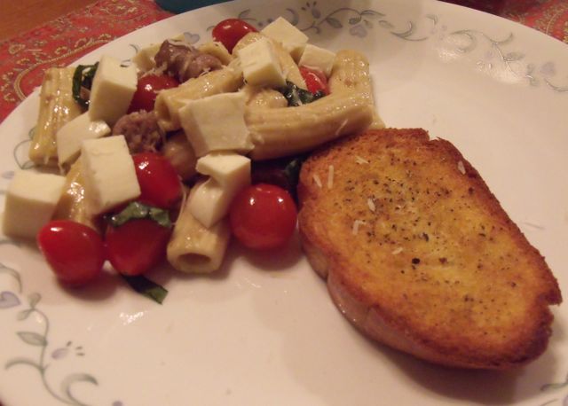 Toss pasta with sausage, tomatoes, garlic, basil, olive oil and grated Parmesan. Add pasta water if needed.