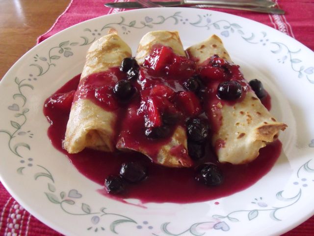 Once crepes are baked, drizzle with fruit sauce. Enjoy!