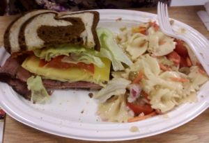 They also have a deli where lunch is a full sandwich with choice of fresh-sliced meat (including Braunschweiger!) and fresh-sliced cheese, along with a heaping portion of house-made side and drink for $5.50. If you order the daily sandwich special, it’s only $4.50. I opted for the pastrami and swiss on rye with pasta salad. It was enough to feed 2 people.
