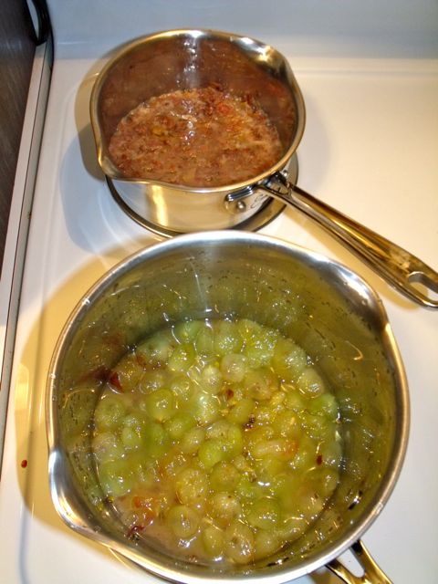 Wash grapes. Pop pulp from skins into separate saucepans. Chop skins and return to saucepan; cover with about 1/2 cup water. Simmer skins and pulp in separate saucepans, 15-20 minutes, stirring occasionally, until skins are soft and pulp has broken down. Push pulp through sieve or ricer to remove seeds. (This part was a pain. If it’s easier, try removing the seeds while you’re popping pulp out of the skins.)